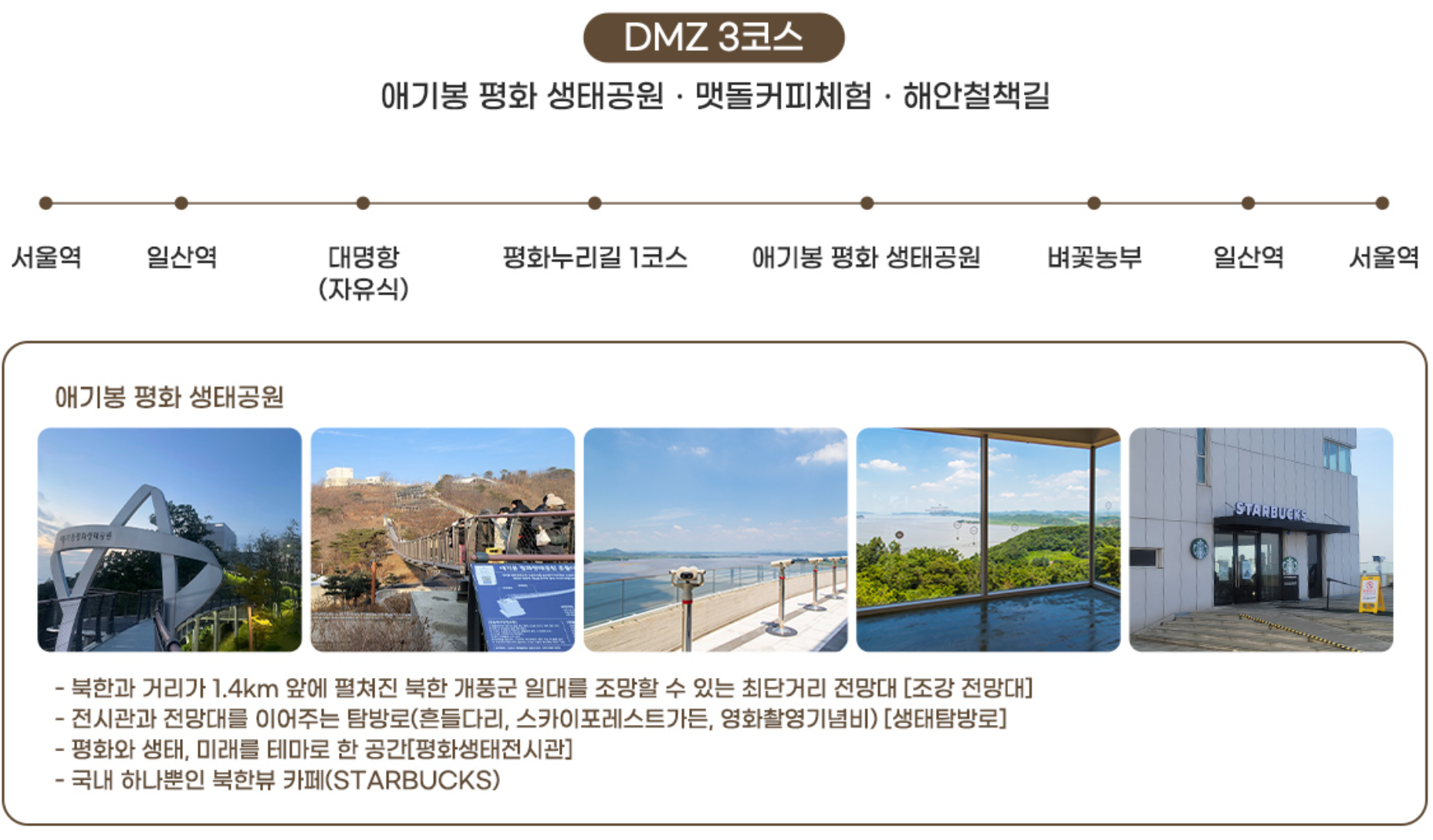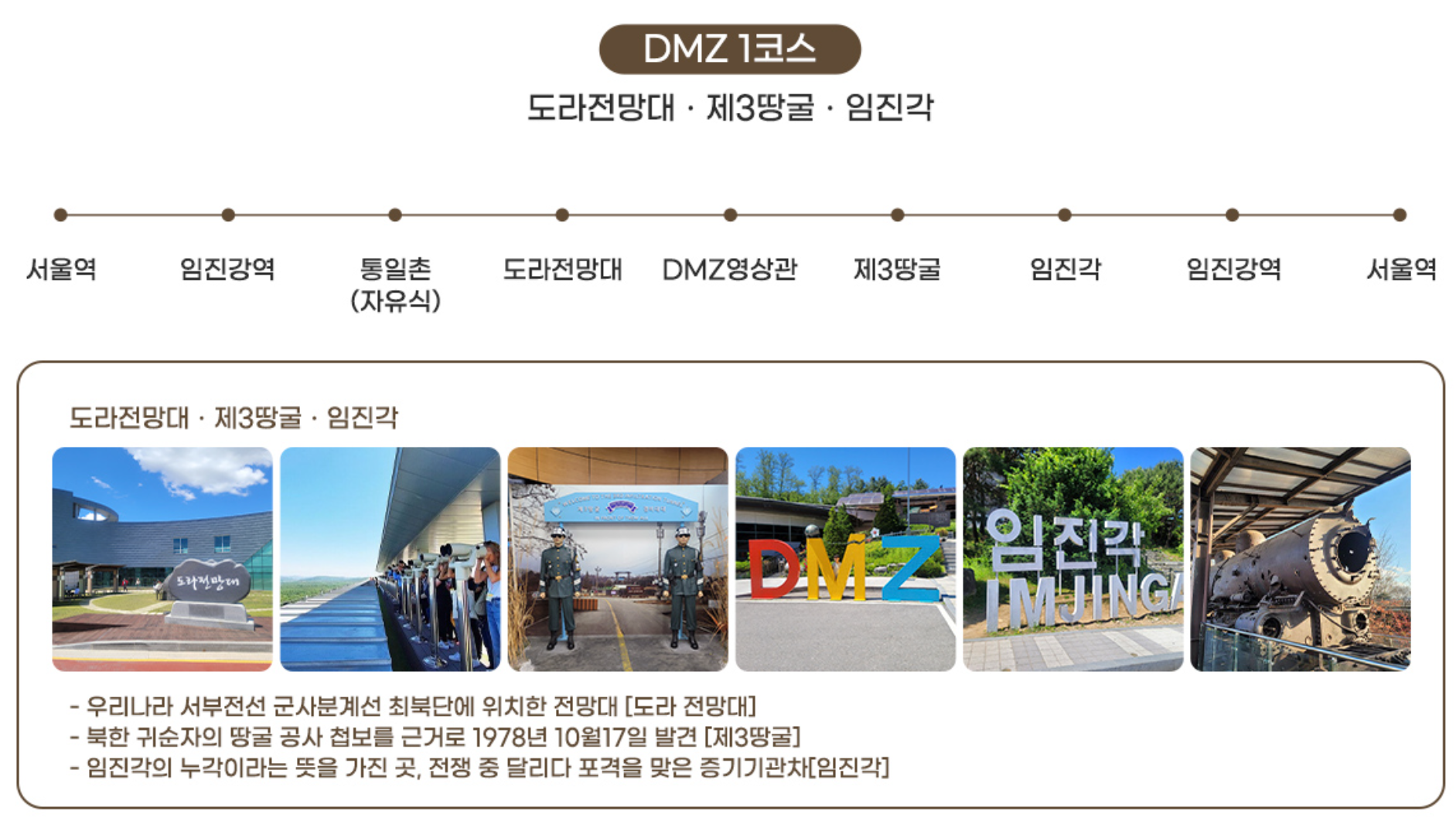 • 서울역 출발 → 도라산역 → 도라전망대 → 제3땅굴 → 통일촌 → 서울 도착