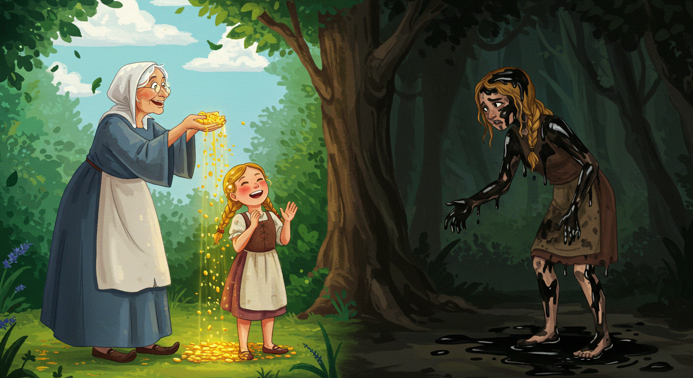이 동화는 근면성실함과 선량함에 대한 보상을 다루는 교훈적 이야기입니다. 부지런한 의붓딸은 홀레 부인으로부터 황금 비를 받는 보상을 받고, 게으른 친딸은 타르(Tar)를 뒤집어쓰는 벌을 받게 됩니다.