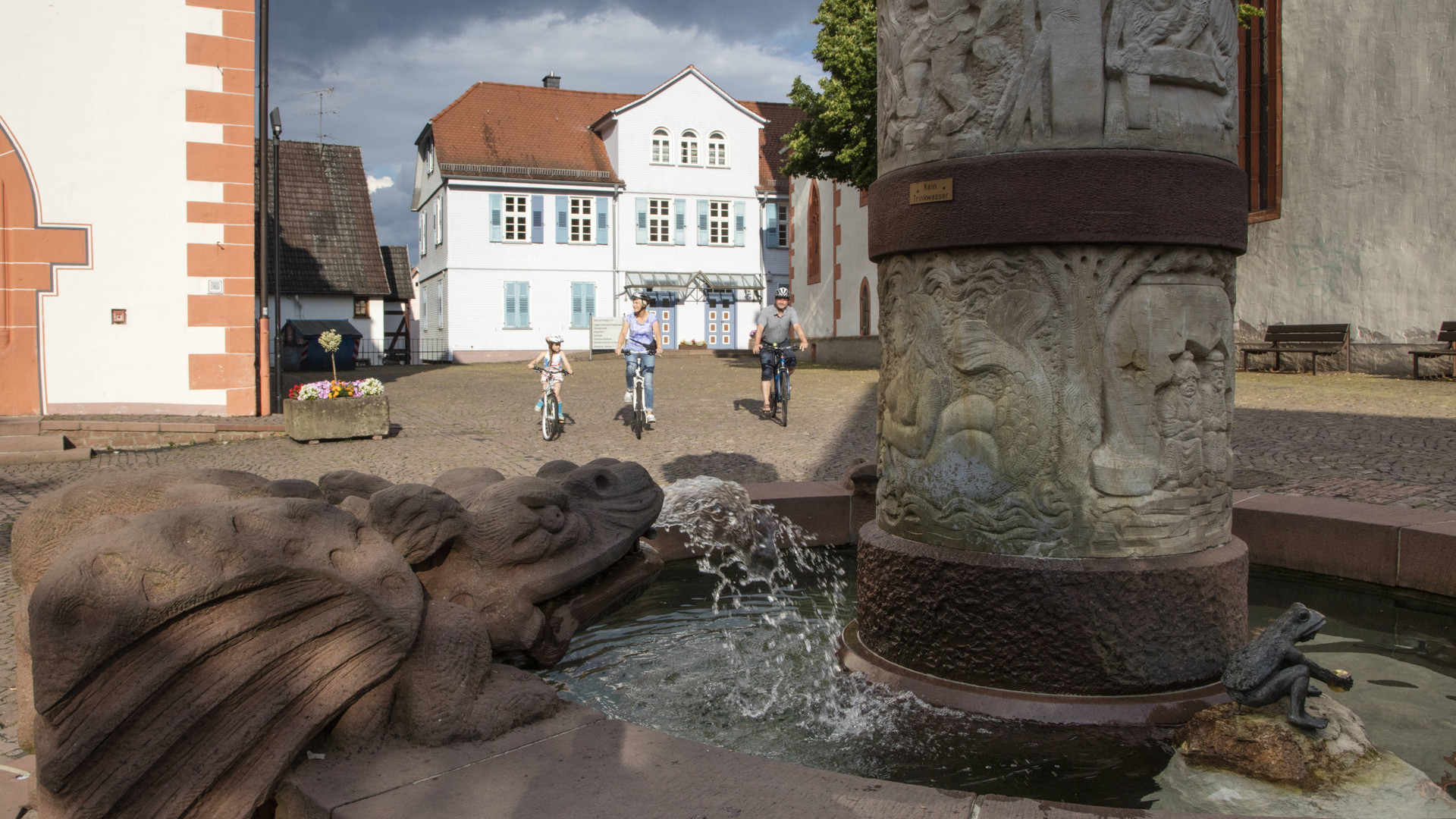 뷔르츠부르크 조각가 W. 핑거-로키트니츠(W. Finger-Rokitnitz)가 제작한 이 분수는 그림 형제의 동화 속 인물들이 3단으로 배치되어 있습니다. 석회암과 사암으로 만들어진 환상적인 분수에는 19가지 동화의 모티프가 새겨져 있어요! 🐸👸