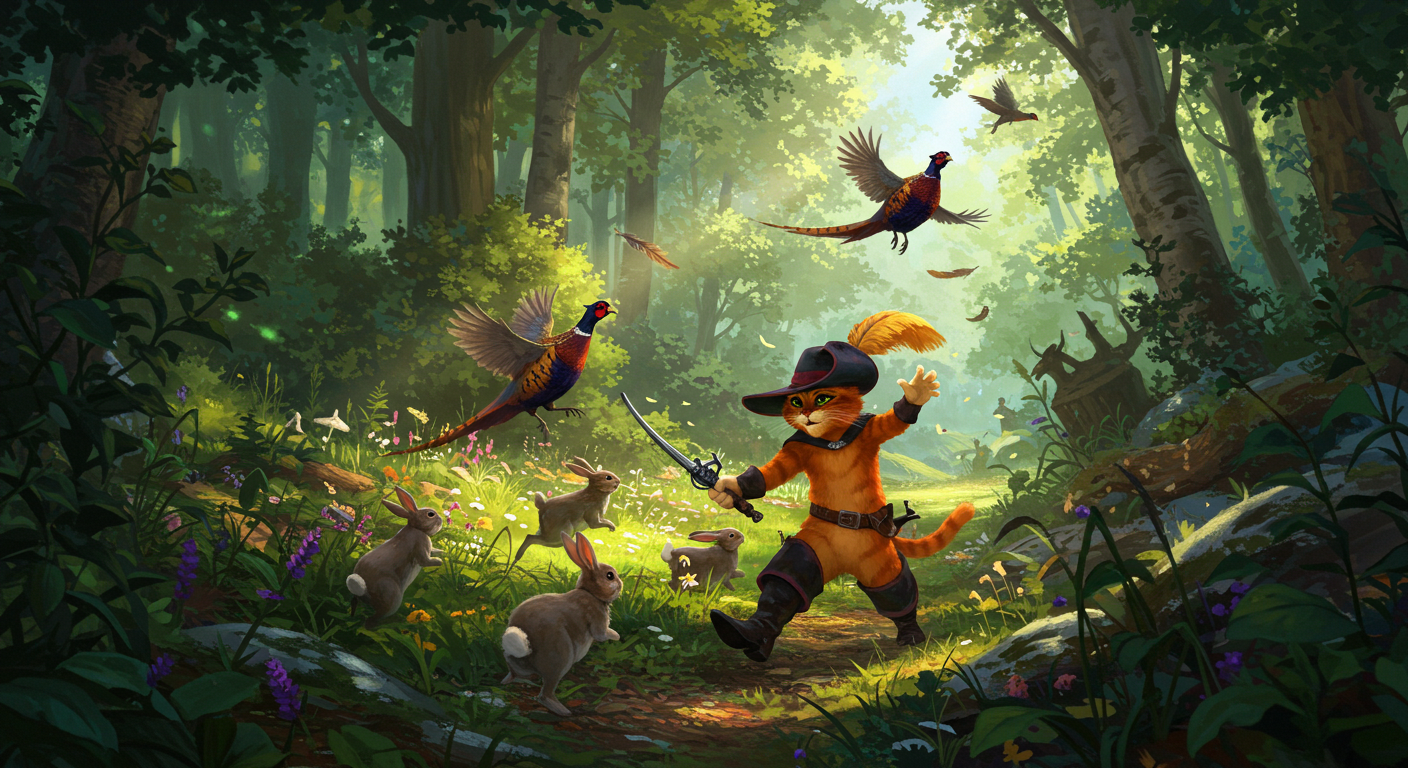 고양이는 장화를 신고 자루로 토끼와 꿩을 잡아 왕에게 바치며, 이것들이 "카라바스 후작"의 선물이라고 거짓말합니다. 🐰🐦