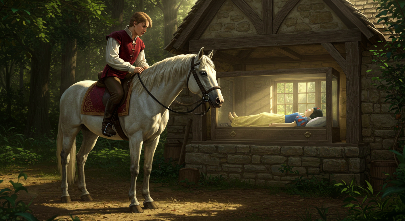어느 날 지나가던 왕자가 숲에서 유리관 속의 아름다운 백설공주를 발견했습니다. 왕자는 한눈에 백설공주에게 반해 키스를 했고, 그 순간 백설공주가 깨어났어요! 목에 걸린 독사과 조각이 빠져나오면서 마법이 풀린 것이었습니다.