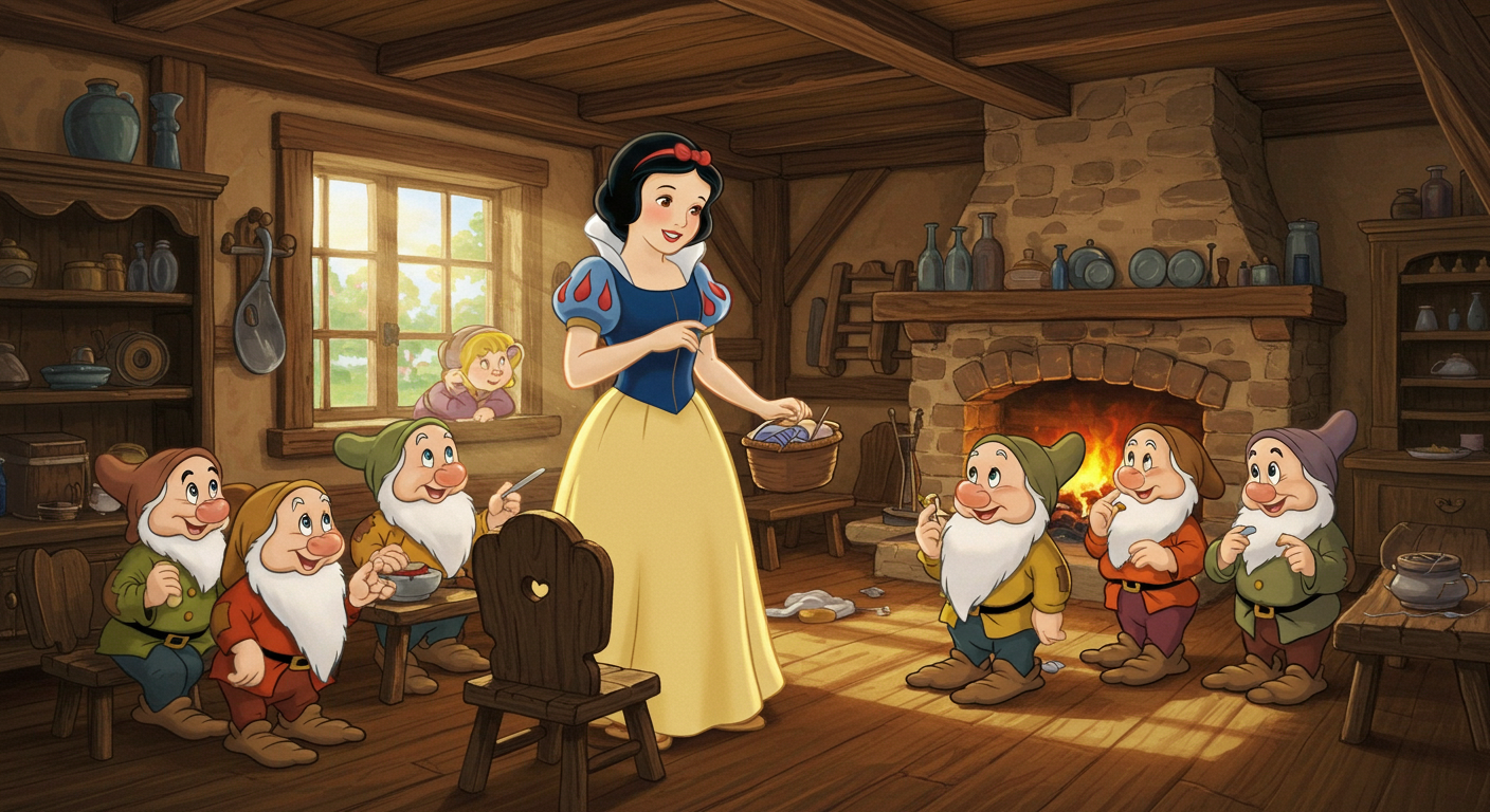 깊은 숲을 헤매던 백설공주는 작고 아담한 집을 발견했습니다. 집 안의 모든 것이 아주 작고 깔끔하게 정리되어 있었어요. 일곱 개의 작은 침대, 일곱 개의 작은 접시...