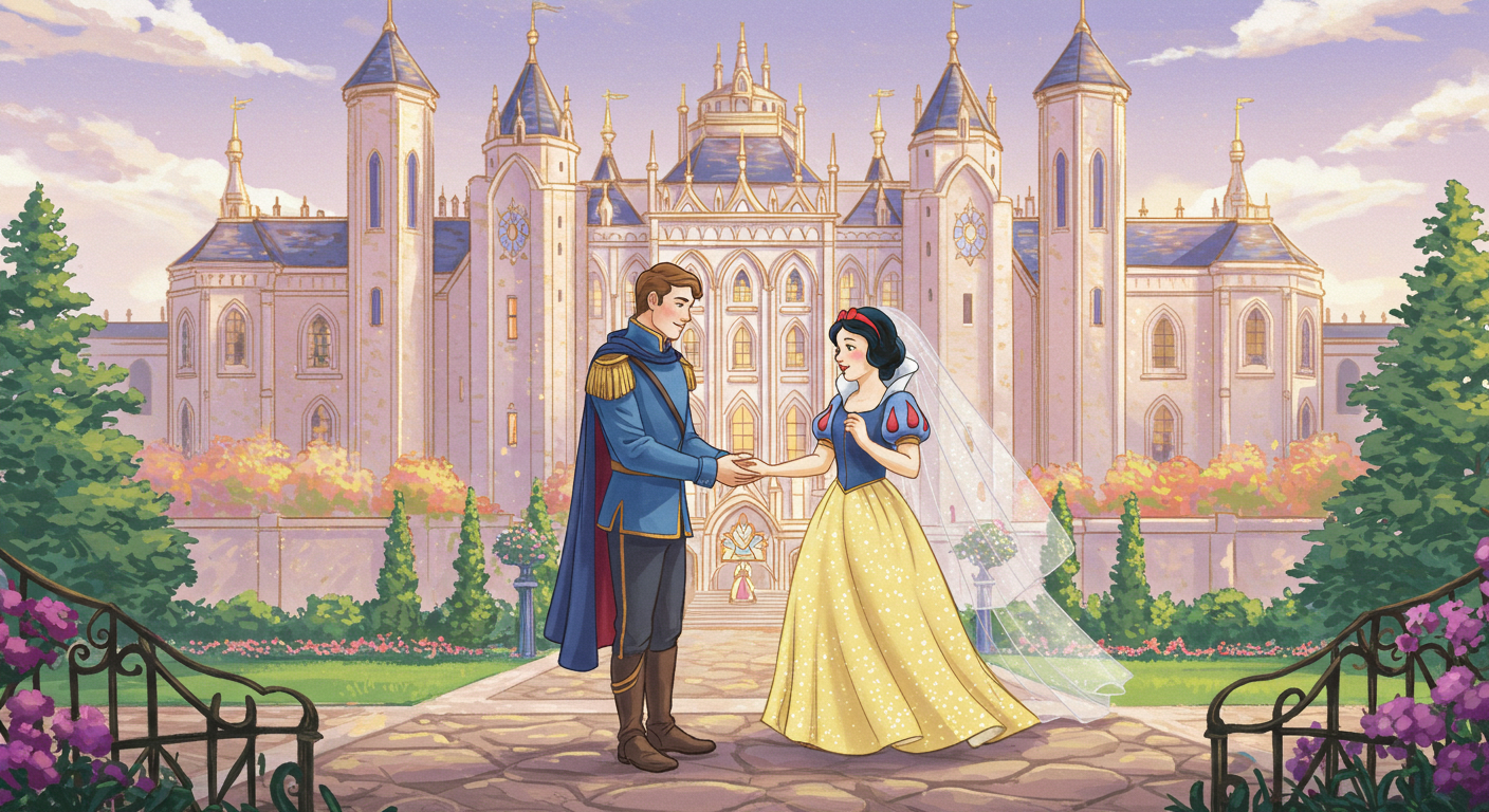 어느 날 지나가던 왕자가 숲에서 유리관 속의 아름다운 백설공주를 발견했습니다. 왕자는 한눈에 백설공주에게 반해 키스를 했고, 그 순간 백설공주가 깨어났어요! 목에 걸린 독사과 조각이 빠져나오면서 마법이 풀린 것이었습니다.