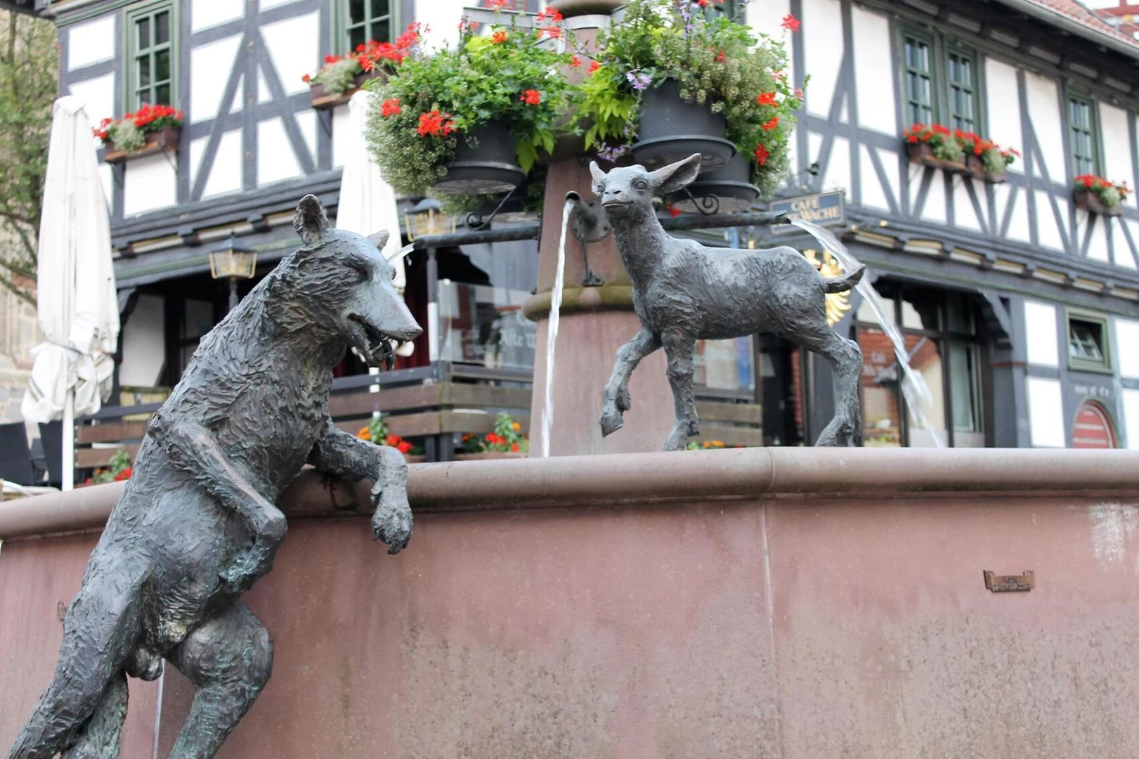 시장 광장에 위치한 동화 분수(Märchenbrunnen)는 볼프하겐의 랜드마크입니다. 실물 크기의 청동 늑대 조각상이 배에 돌을 가득 채운 채로 서 있고, 분수 가장자리에는 일곱 번째 아기 염소가 서 있는 모습을 볼 수 있습니다. 🌊