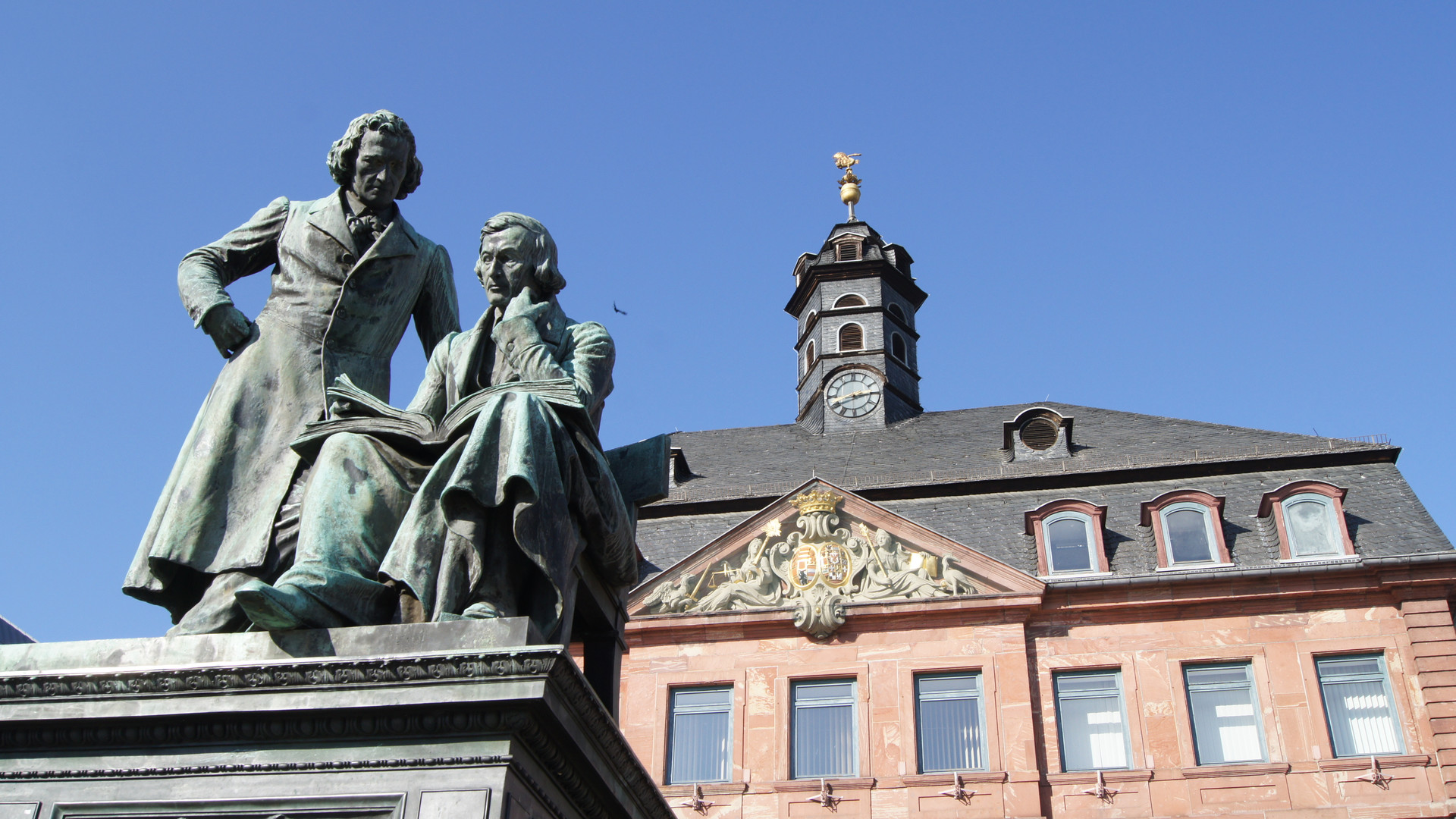 메르헨 가도의 공식적인 시작점인 이 광장에는 야콥과 빌헬름 그림의 웅장한 기념비가 서 있습니다. 이곳에서 동화의 여행이 시작됩니다! 📍