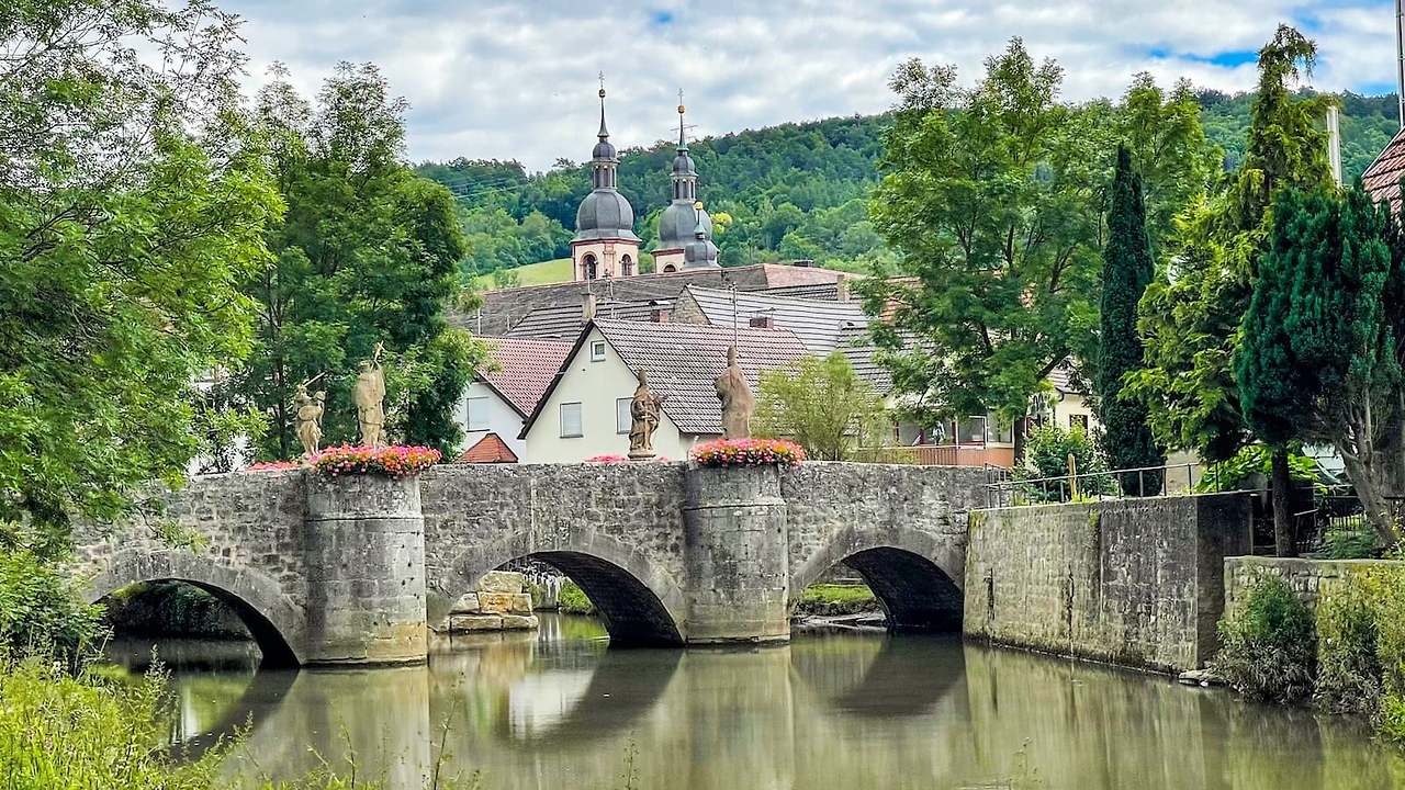 "언덕 위의 낙원 — 프랑켄 바로크 전성기의 화려한 교회를 품은 와인 도시. 역사적인 다리, 당당한 목골조 건물, 향토 박물관, 그리고 6세기에 걸친 노변 십자가상."