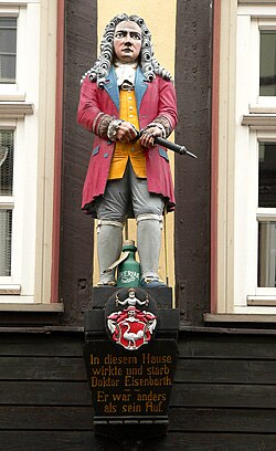 우측: 요한 안드레아스 아이젠바르트가 한뮌덴에서 사망한 생가 앞의 신축 건물에 있는 나무 조각상. 그가 사망한 생가는 1895년에 철거되었습다.