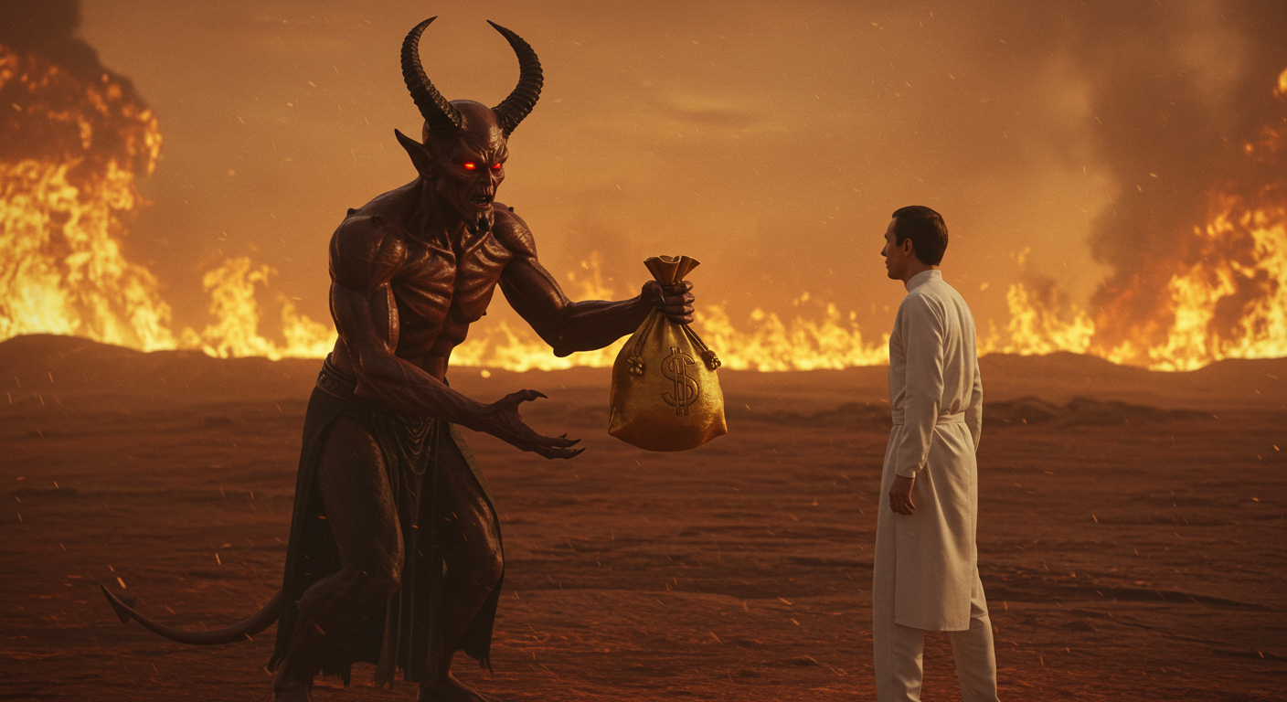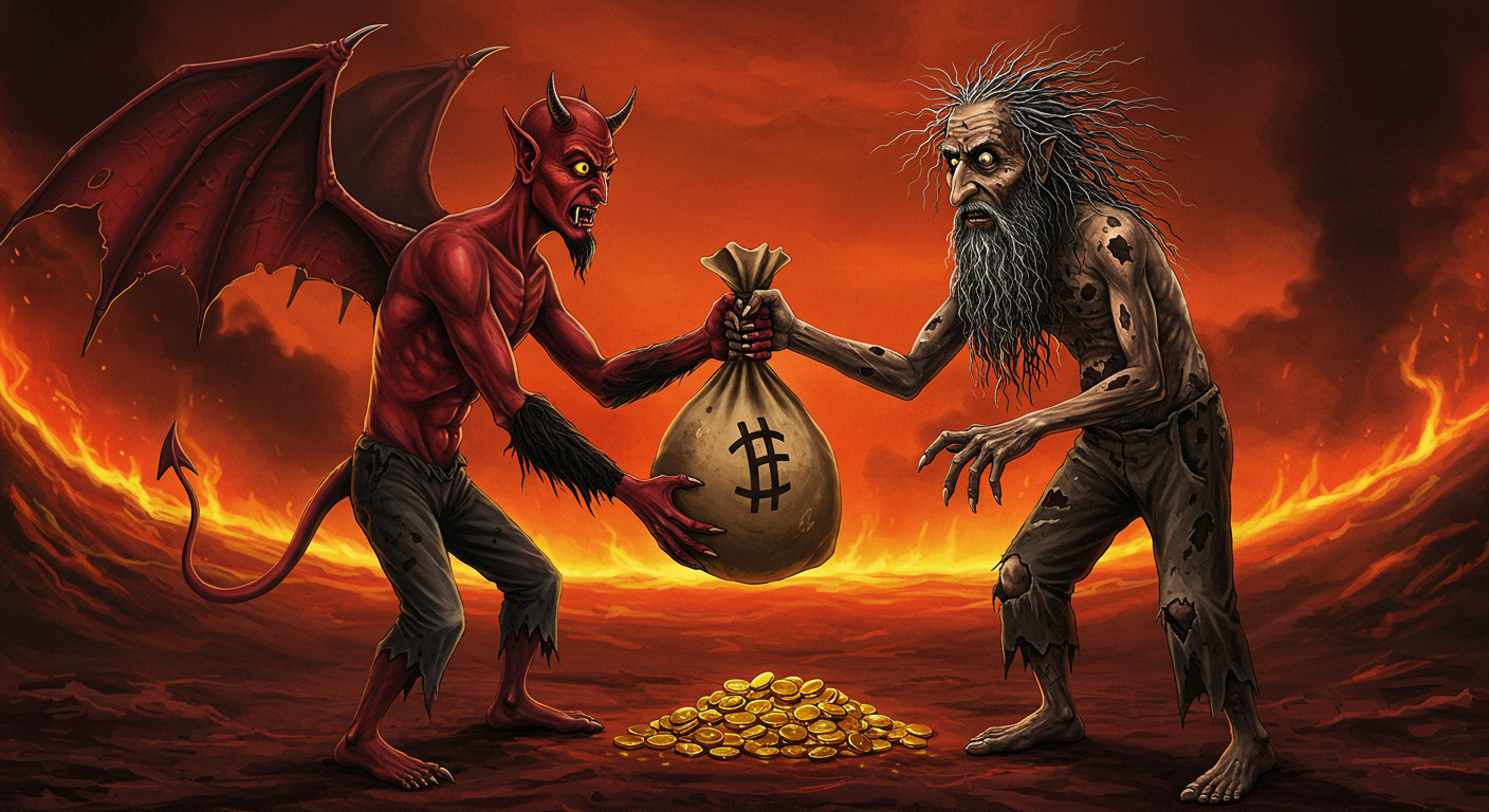 악마는 손가락을 튕기자 갑자기 황금 동전들이 공중에 춤을 추었다. 한스의 눈이 휘둥그레졌다. 💰