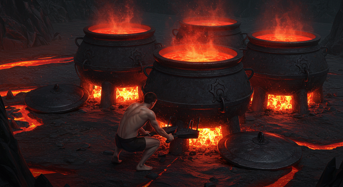 거대한 가마솥들이 지옥 중앙에 일렬로 놓여있었는데, 악마는 절대 들여다보지 말라고 엄명했던 것이다.