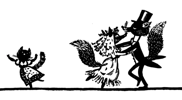 하지만 젊은 여우가 나타났을 때, 여우 부인이 야옹이에게 물었어요: "그분이 빨간 반바지를 입고 있니? 뾰족한 주둥이를 가지고 있니?"
